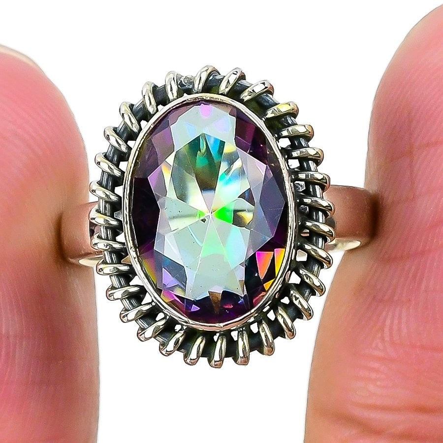 Mystic Rainbow Topaz Stone 925 Silver Art Deco Boho Statement Ring Jewelry US 8