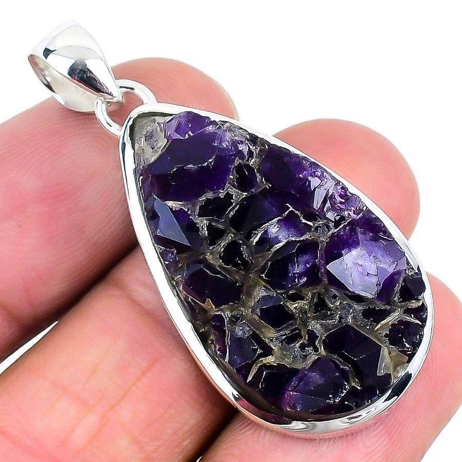 Natural Amethyst Druzy Sisters Gift Channel Set Trendy Pendant Sterling Silver