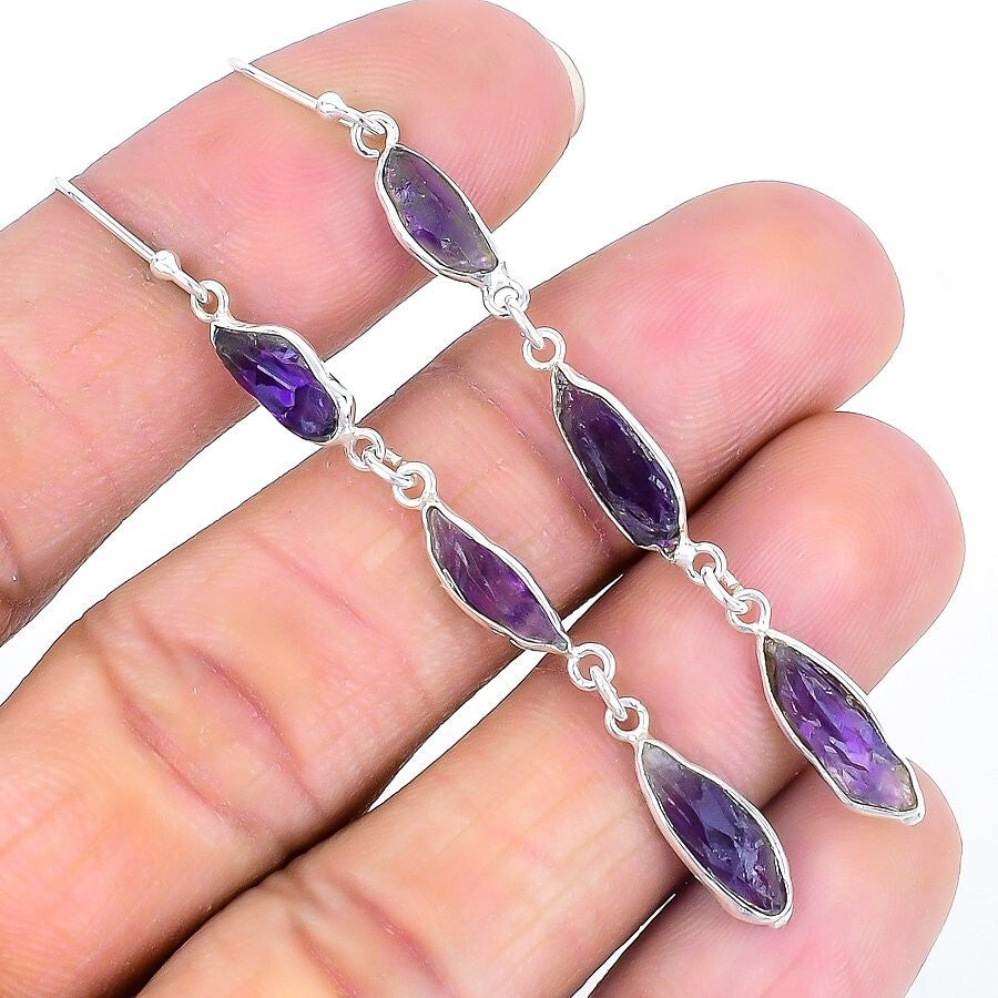 Natural Amethyst Druzy Sterling Silver Sister Dangle Drop Boho Hook New Earrings