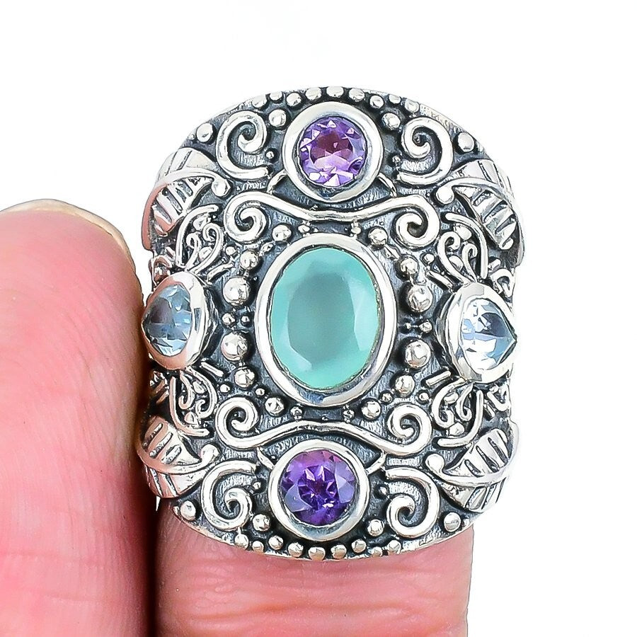 Natural Aqua Chalcedony Solid Silver Cluster Wedding Boho Ring Jewelry Size 6.5