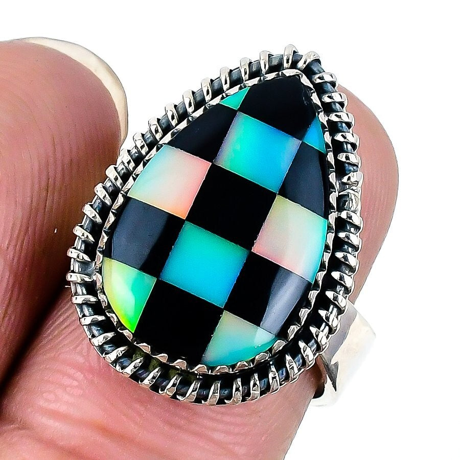 Natural Aurora Opal checkerboard 925 Sterling Silver Statement Memorial Day Ring