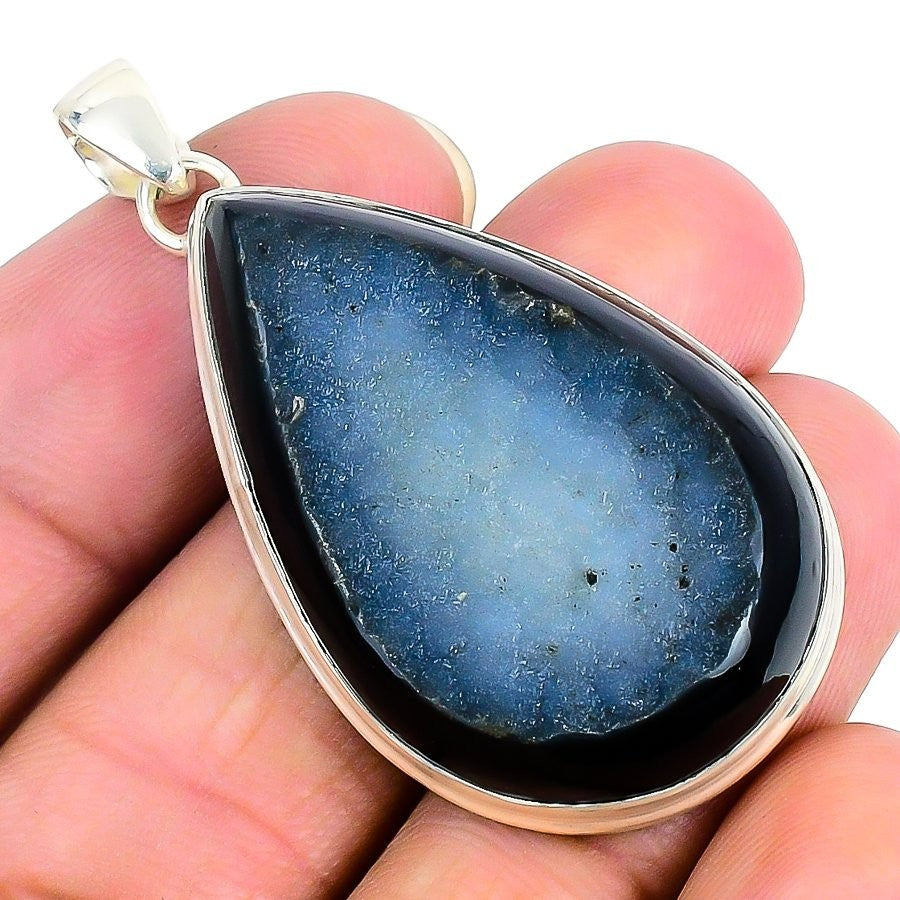 Natural Black Druzy Bezel Anniversary New Pendant Jewelry Solid Sterling Silver