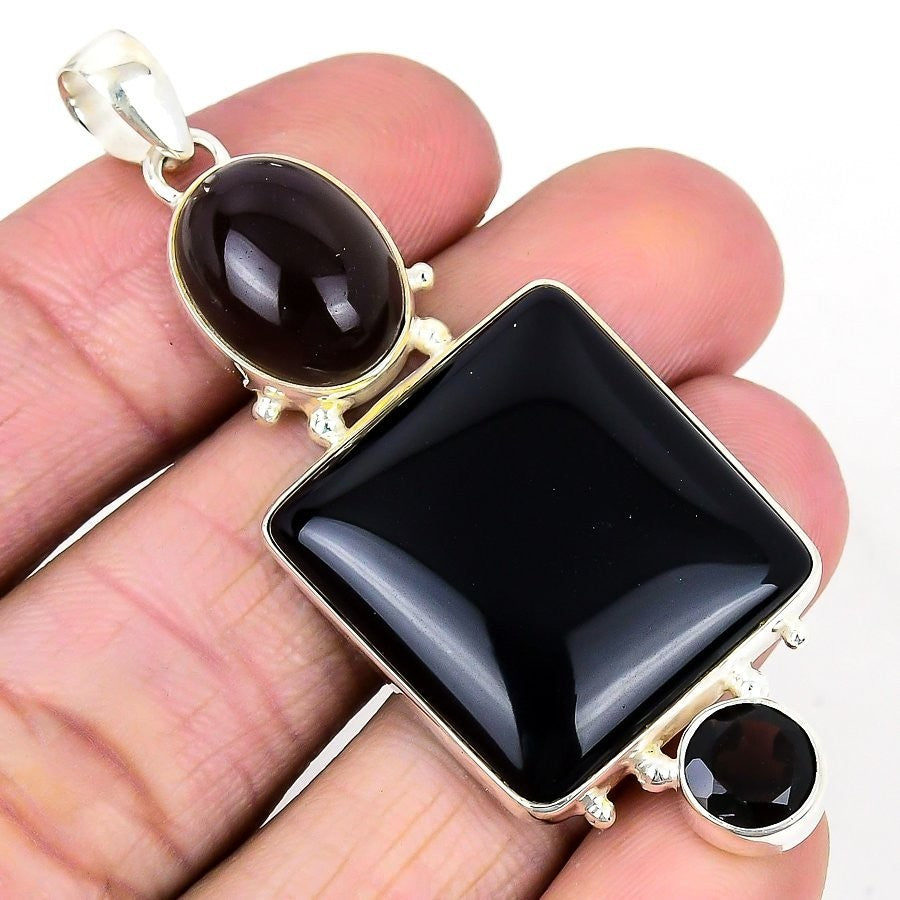 Natural Black Onyx Daughter Gift Root Chakra Ethnic Pendant 925 Sterling Silver