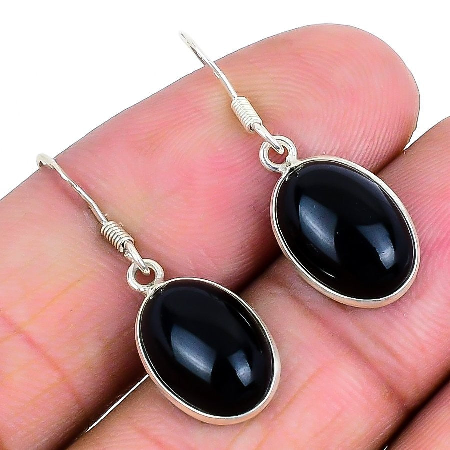 Natural Black Onyx Solid Sterling Silver Dangling Hook Ethnic Birthday Earrings