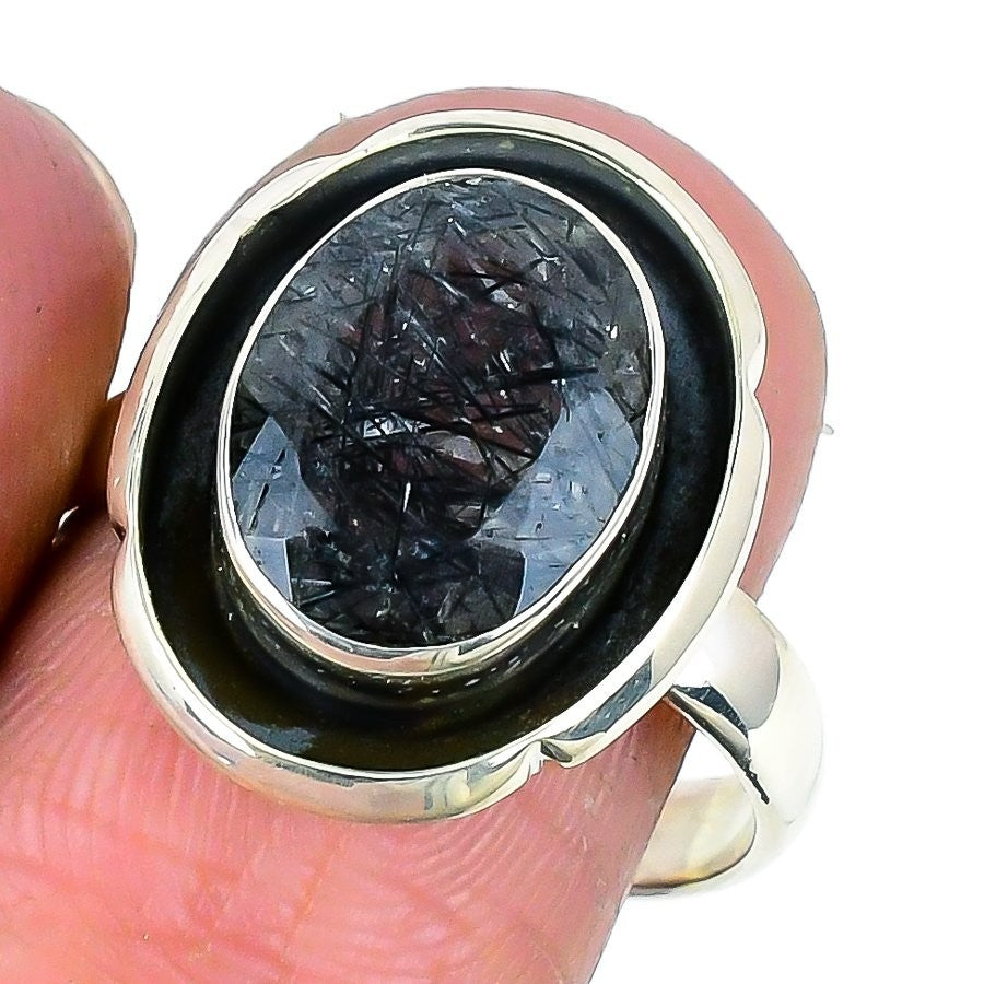 Natural Black Rutile Faceted 925 Sterling Silver Birthday Statement Ring Jewelry