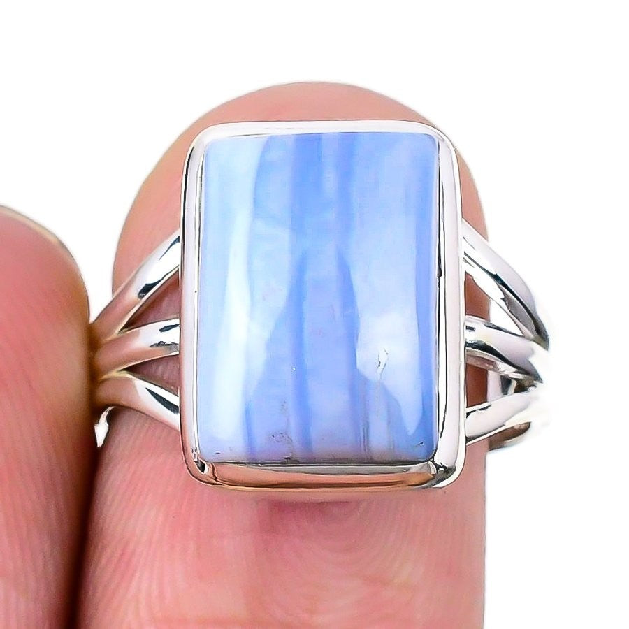 Natural Blue Lace Agate Handcrafted Statement Ring Jewelry Size 7.5 Solid Silver