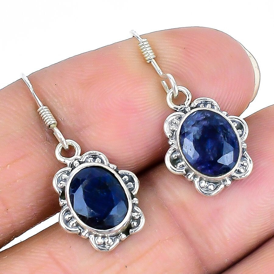 Natural Burmise Sapphire Ethnic Boho Drop Dangle Earrings 925 Sterling Silver