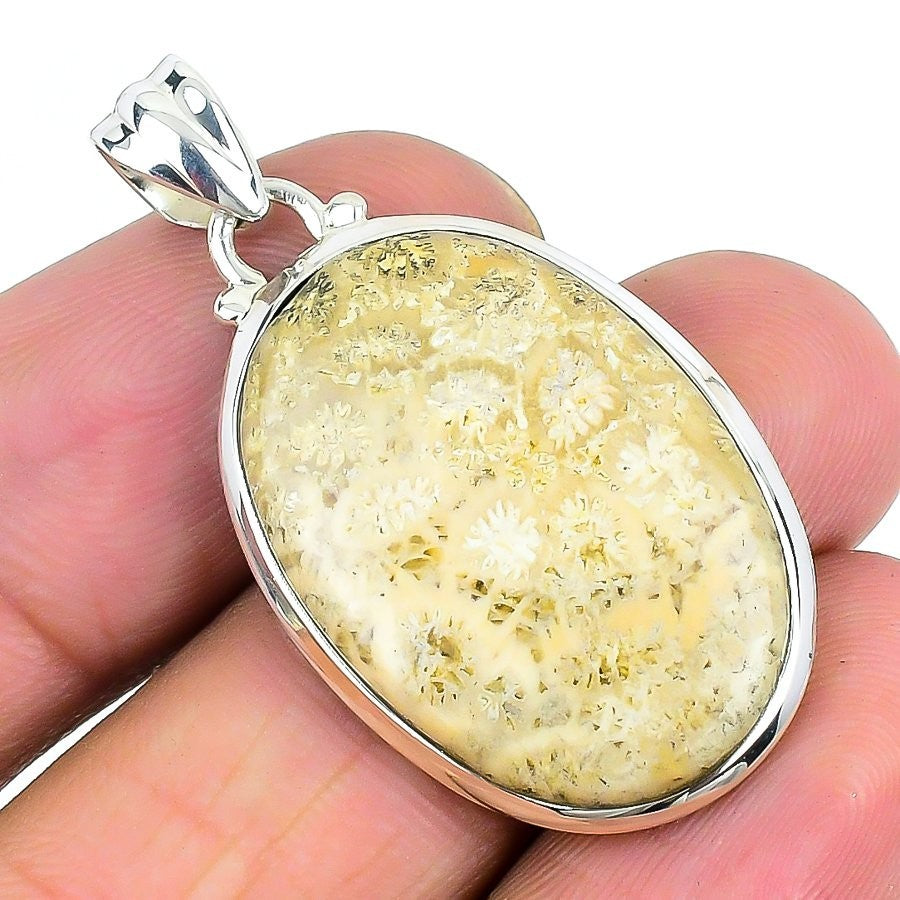 Natural Fossil Coral Solid Sterling Silver Ethnic Art Deco Boho Pendant Jewelry