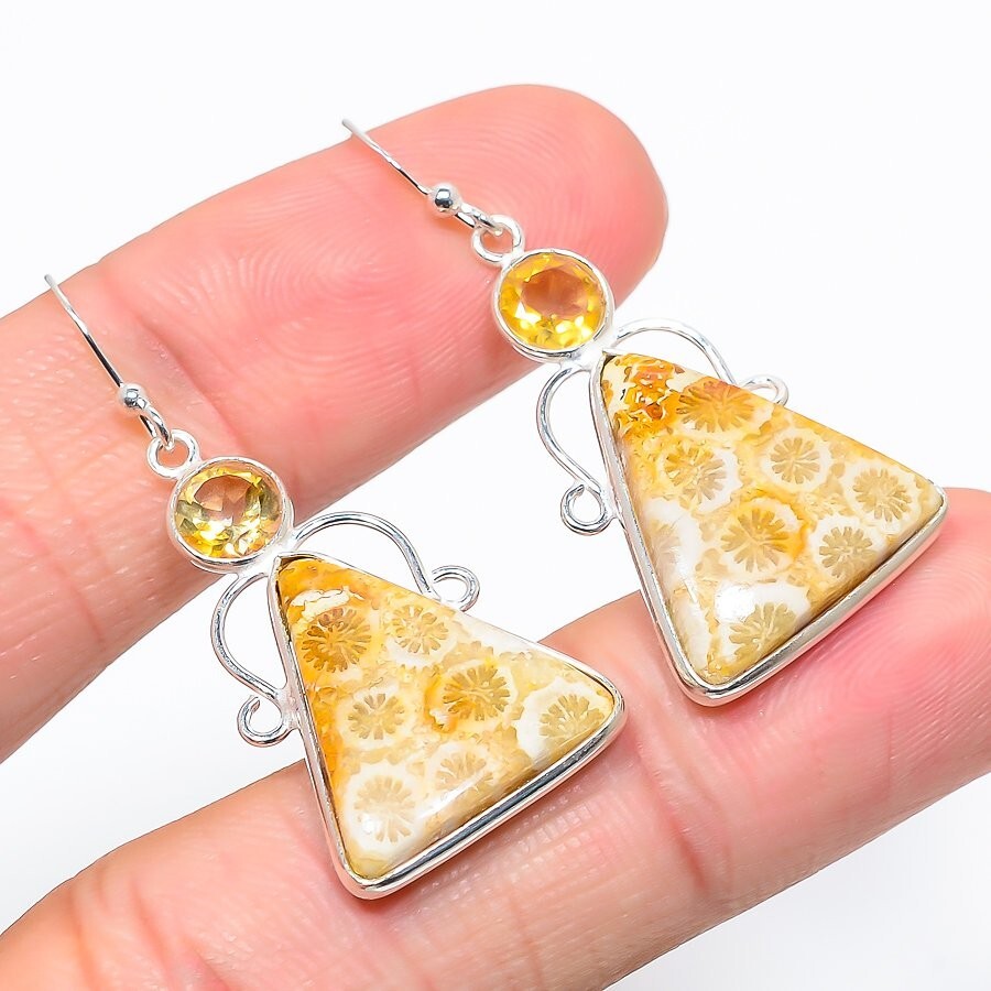 Natural Fossil"Coral 925 Silver Anniversary Dangle Daughter Hook Unique Earrings