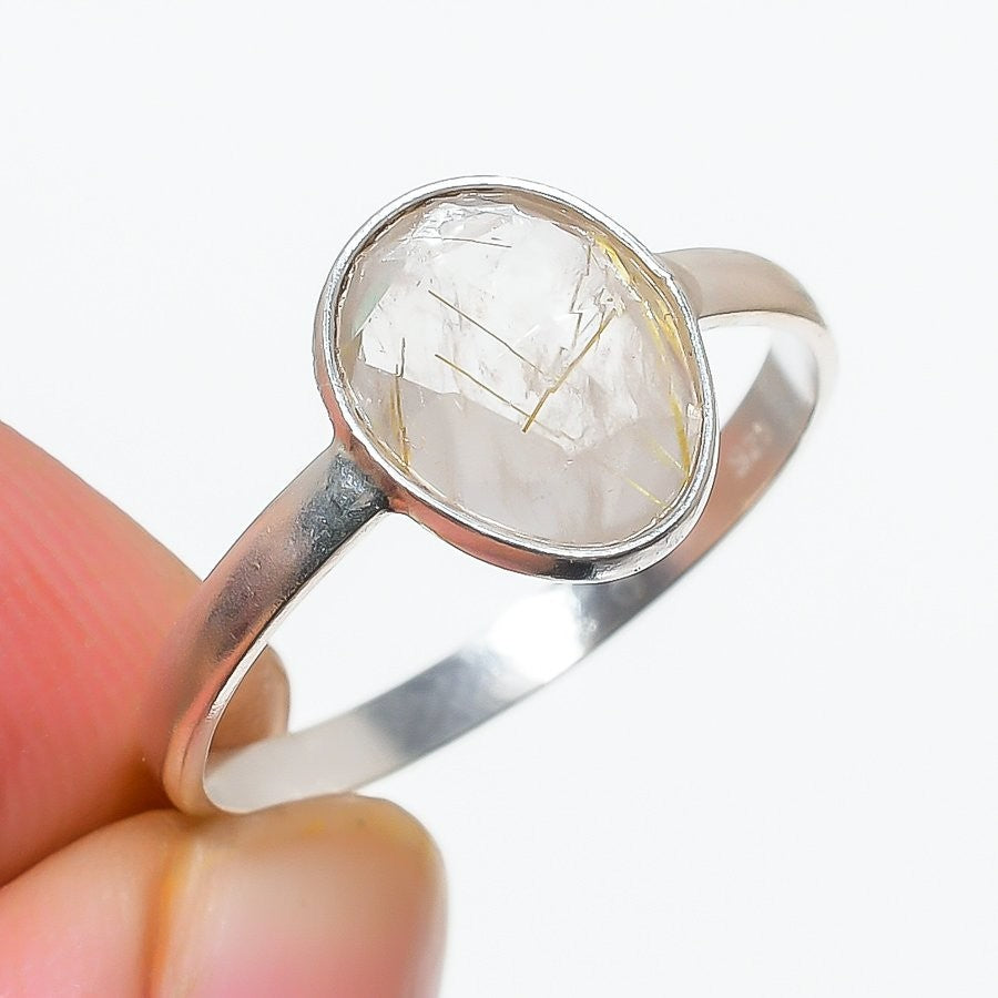 Natural Golden Rutile 925 Sterling Silver Cluster Birthday Art Deco Ring Jewelry