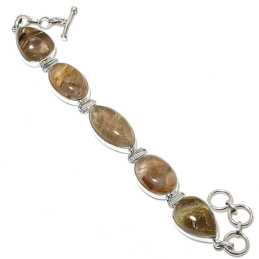 Natural Golden Rutile Bezel Chain Mother Best Friend Gift Bracelet Solid Silver