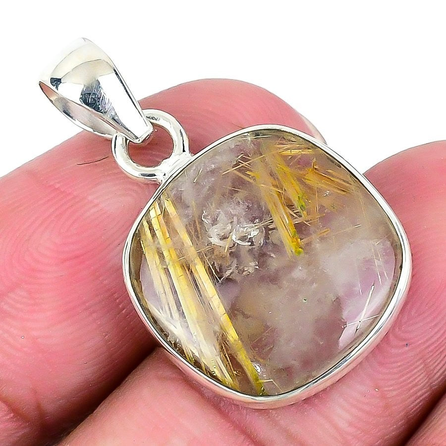 Natural Golden Rutile Solid Silver Wife Birthday Unique Channel Set Boho Pendant