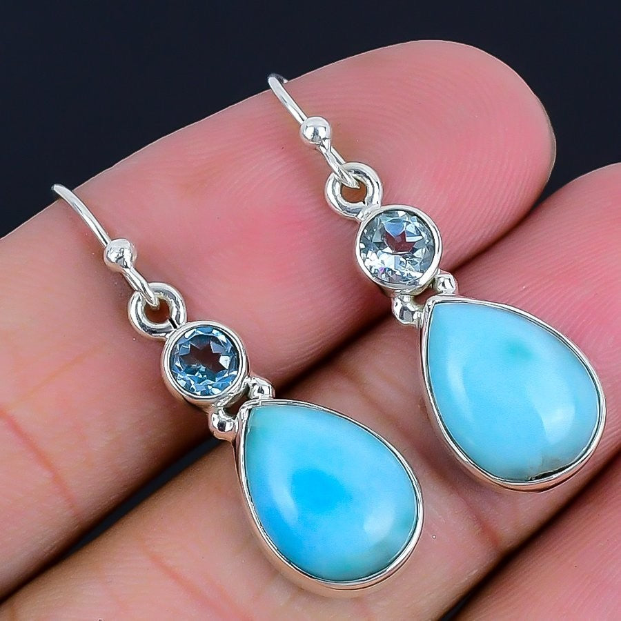 Natural Larimar 925 Solid Silver Elegant Dangle Drop Friend Gift Ethnic Earrings