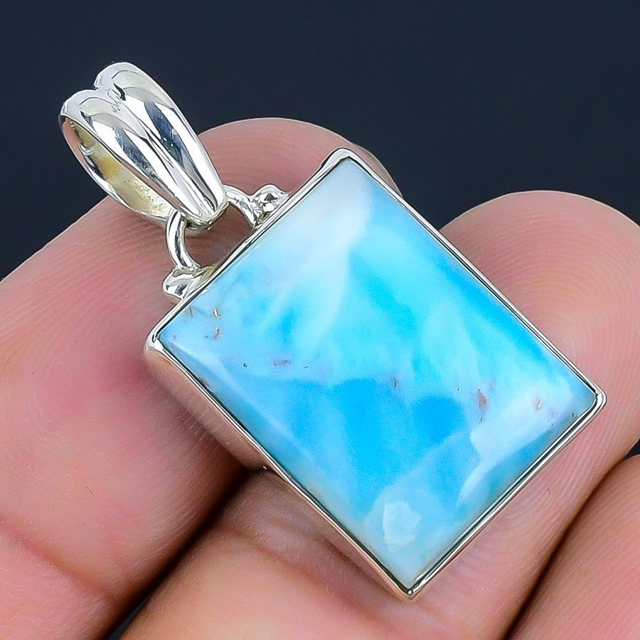 Natural Larimar Solid Silver Handcrafted Art Deco Bezel Handmade Pendant Jewelry