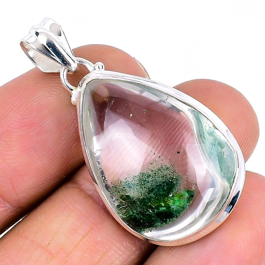 Natural Lodolite Garden Quartz 925 Sterling Silver Handcrafted Pendant Jewelry