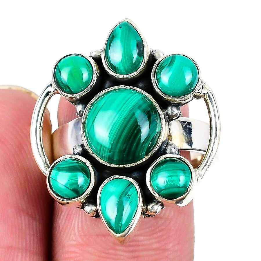 Natural Malachite 925 Sterling Silver Elegant Statement Sister Boho Ring US 8.5