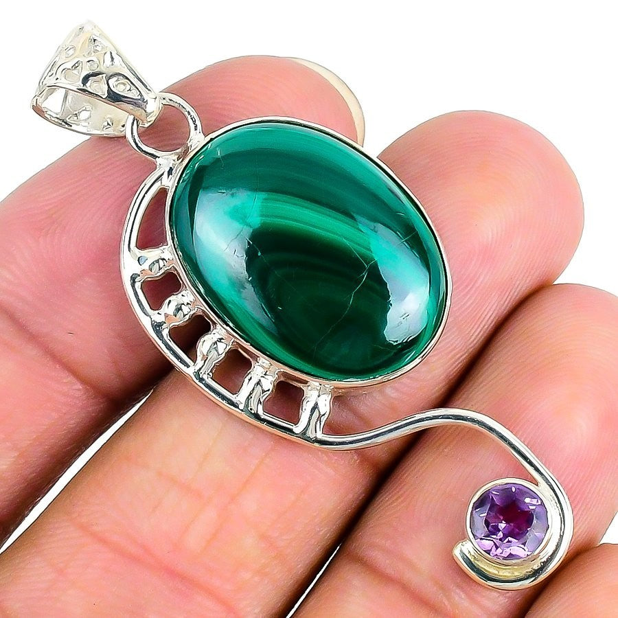 Natural Malachite Sterling Silver Sister Handmade Handcrafted Pendant Jewelry