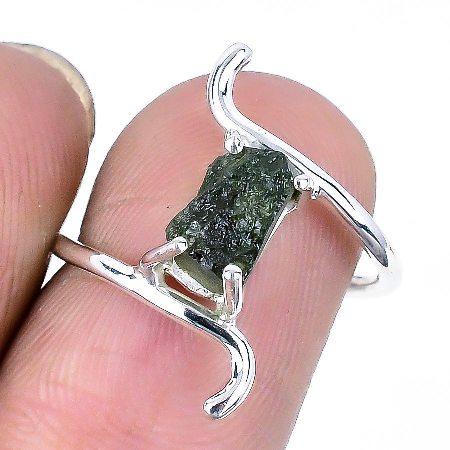 Natural Moldavite Solid Sterling Silver Statement Art Deco Ring Jewelry US 7.5