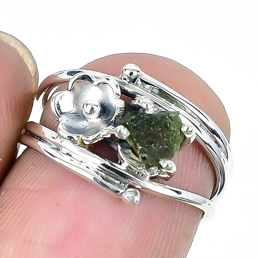 Natural Moldavite Sterling Silver Statement Elegant Birthday Unique Ring Jewelry