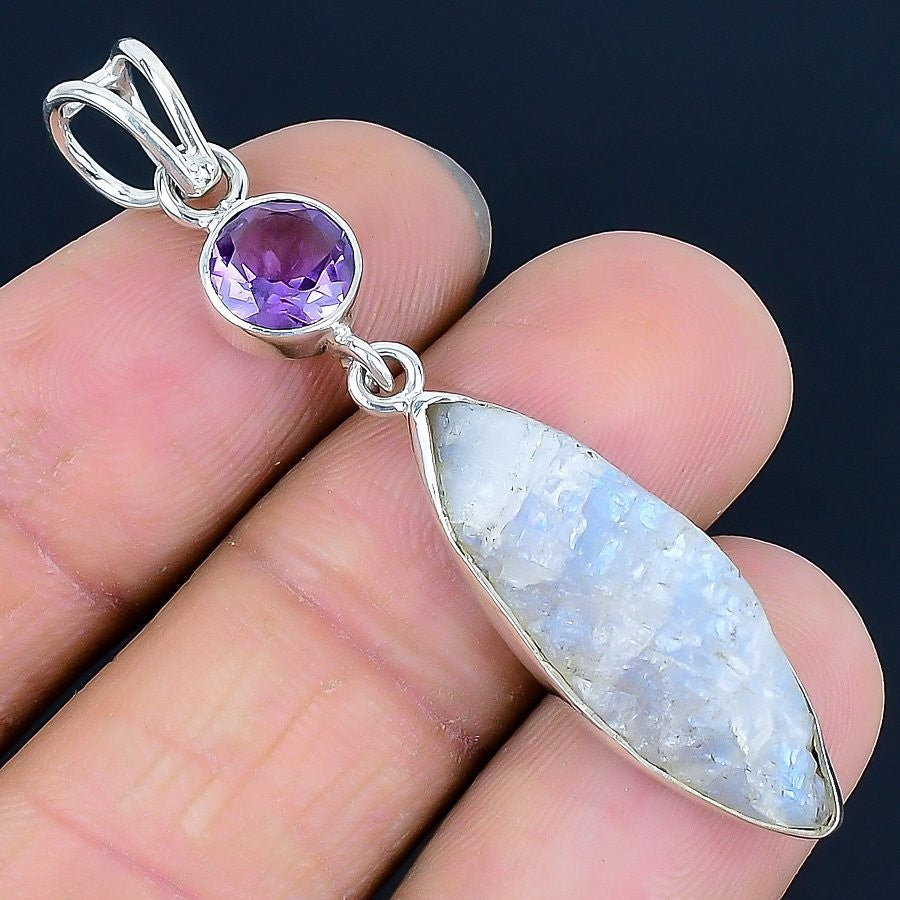 Natural Moonstone Druzy Art Deco Daughters Day Boho Pendant 925 Sterling Silver
