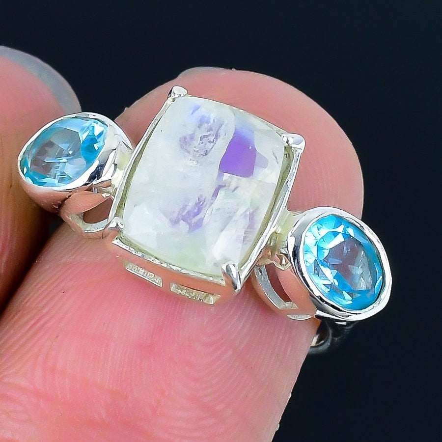 Natural Moonstone Faceted Statement June Birth Ring Solid Sterling Silver US 6.5