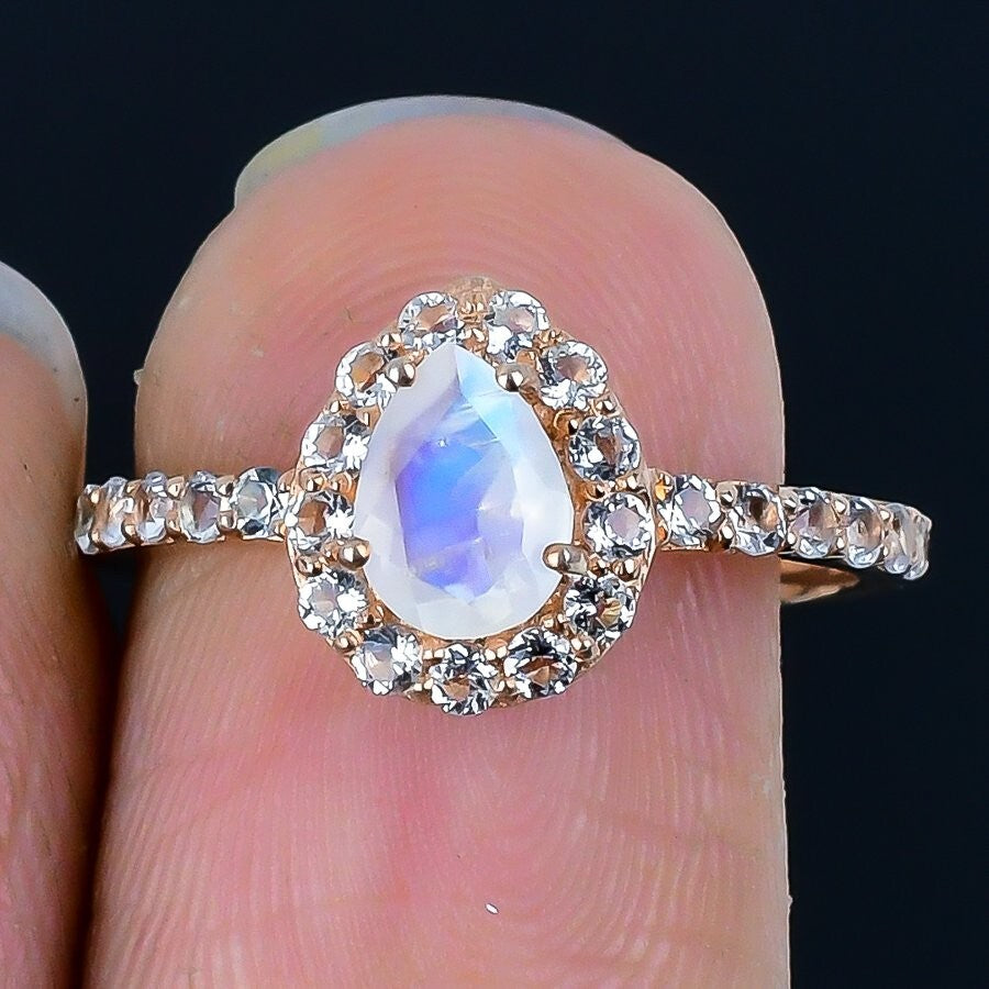 Natural Moonstone Faceted Statement Ring Jewelry 925 Silver Rose Gold Vermeil