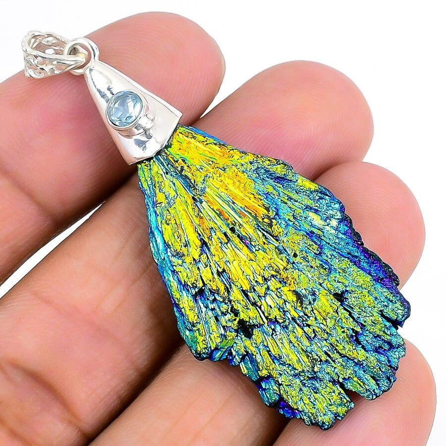 Natural Peacock Titanium Aura 925 Sterling Silver Sister Wedding Pendant Jewelry