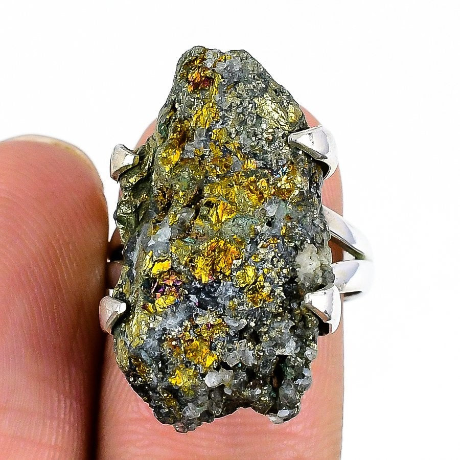 Natural Pyrite Druzy 925 Solid Silver Sister Bezel Statement Ring Jewelry Size 7