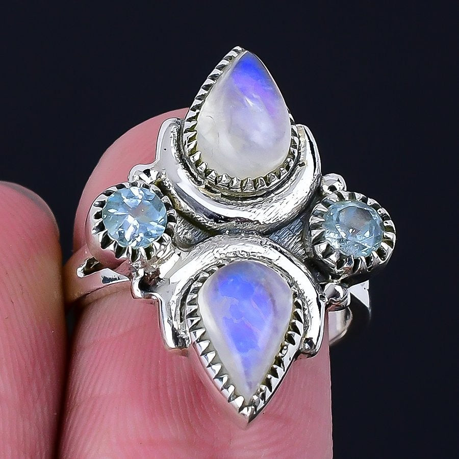 Natural Rainbow Moonstone 925 Sterling Silver Sister Cluster Ethnic Ring Size 7