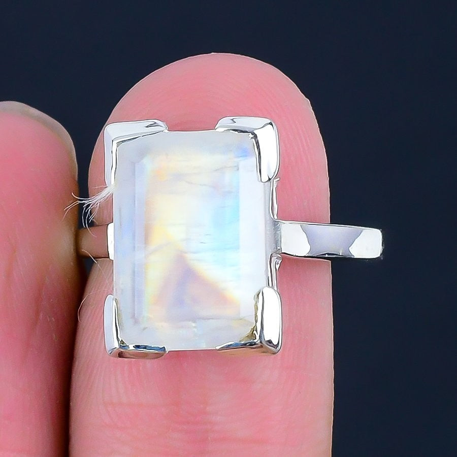 Natural Rainbow Moonstone Faceted Cluster Ring Jewelry Size 7.5 Sterling Silver
