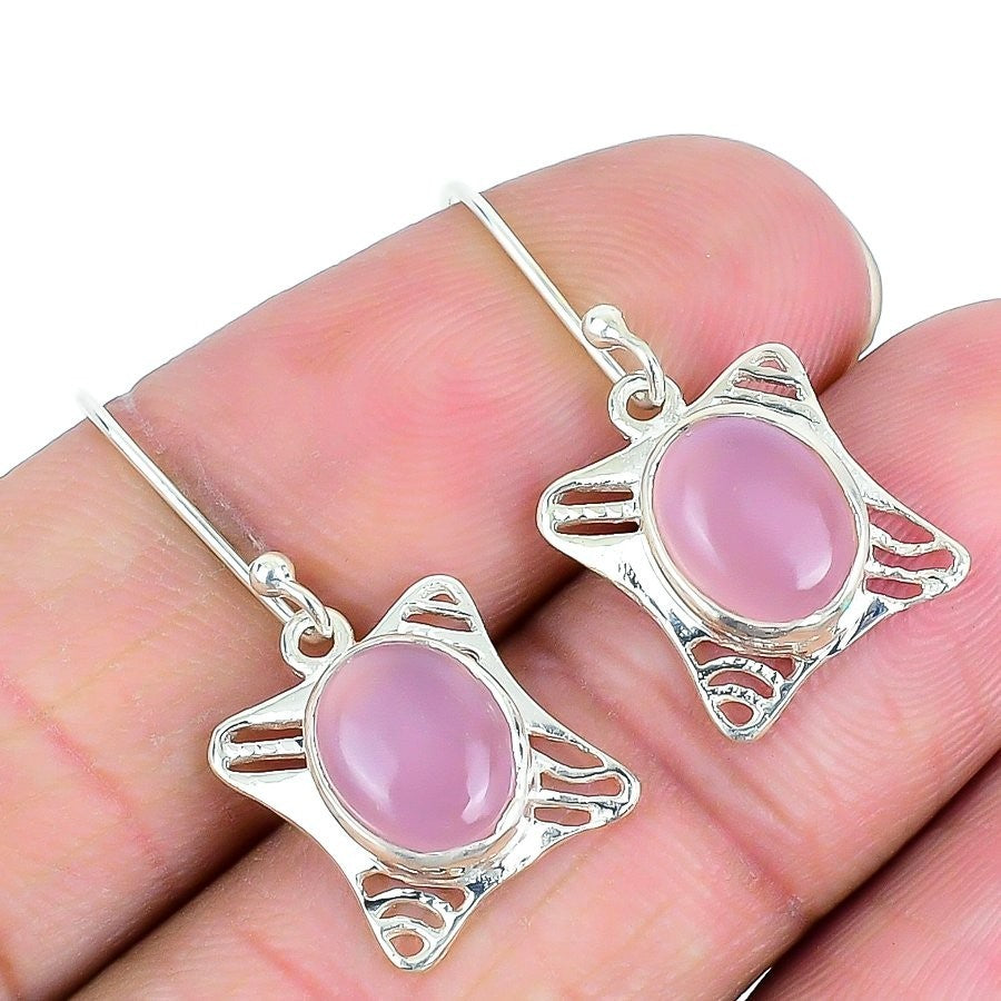Natural Rose Quartz 925 Silver Dangling Sister Bezel Elegant Earrings Jewelry