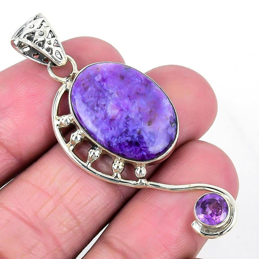Natural Russian Charoite 925 Sterling Silver Wedding Channel Set Pendant Jewelry
