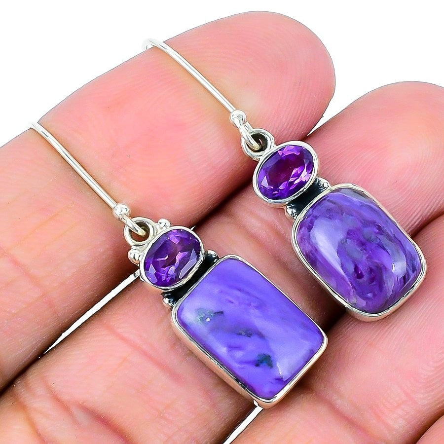 Natural Russian Charoite Solid Silver Birthday Handmade Drop Hook Wife Earrings