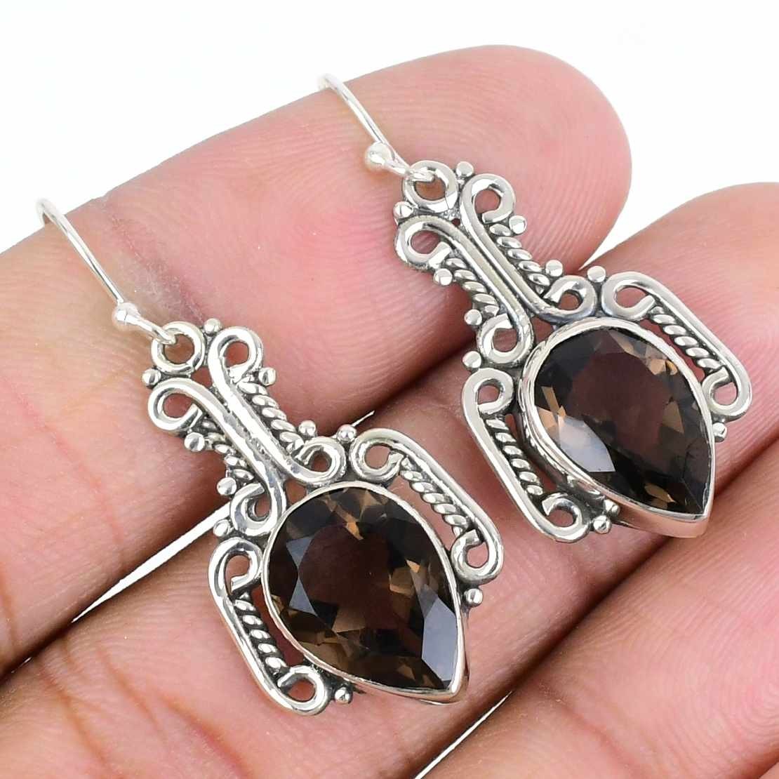 Natural Smokey Topaz Solid Silver Daughters Day Wife Dangle Drop Hook Earrings