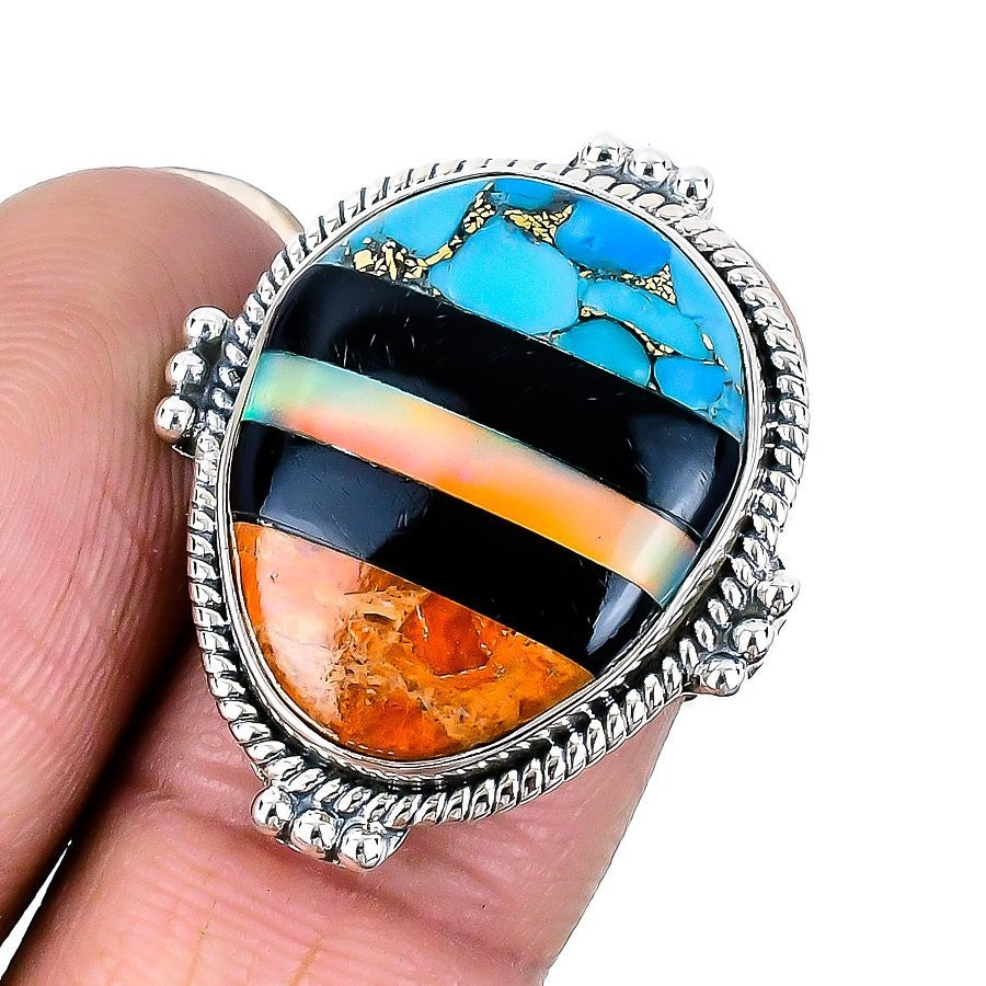 Natural Spiny Oyster Matrix 925 Silver Anniversary Birthday Statement Ring US 7