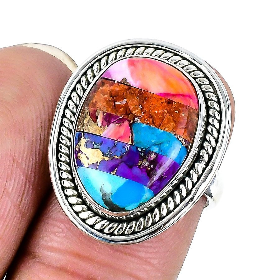 Natural Spiny Oyster Matrix 925 Silver Boho Statement Anniversary Wife Ring US 7