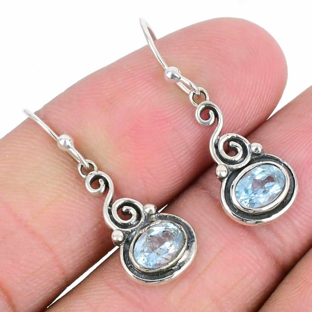 Natural Swiss Blue topaz Solid Sterling Silver Drop Handcrafted Earrings Jewelry