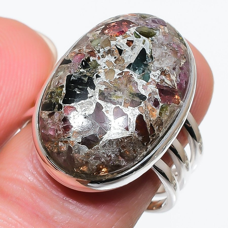 Natural Watermelon Tourmaline Sister New Cluster Ring Jewelry 925 Solid Silver