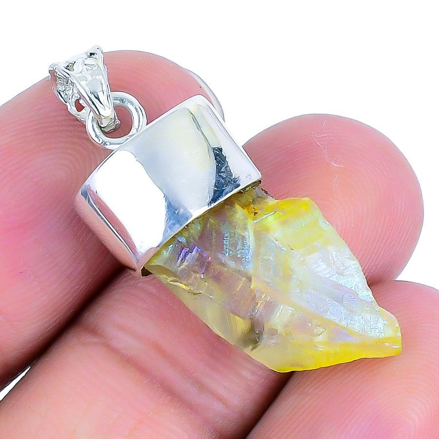 Natural Yellow Aura Crystal Ethnic Bezel Pendant Jewelry Solid Sterling Silver