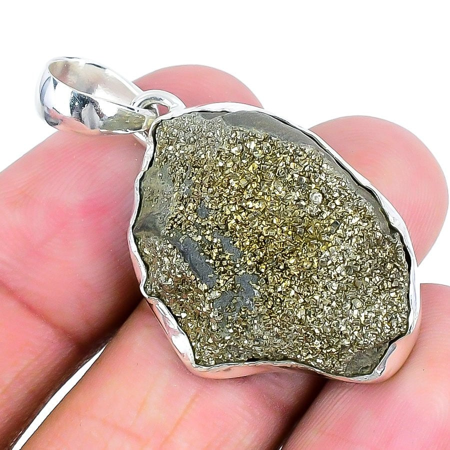 Pyrite Druzy Stone Solid Sterling Silver New Birthday Art Deco Pendant Jewelry