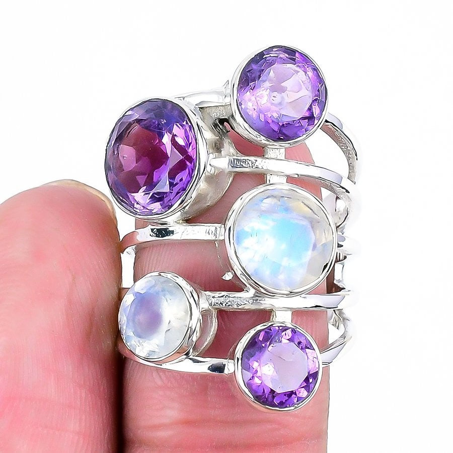 Rainbow Moonstone Faceted Stone Sterling Silver Ethnic New Cluster Ring Size 7.5