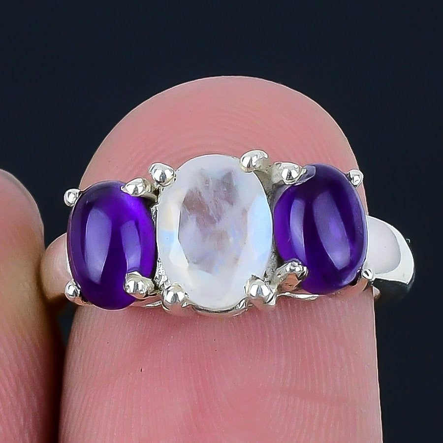 Rainbow Moonstone Stone 925 Solid Silver Wife Statement Unique Ring Jewelry US 6