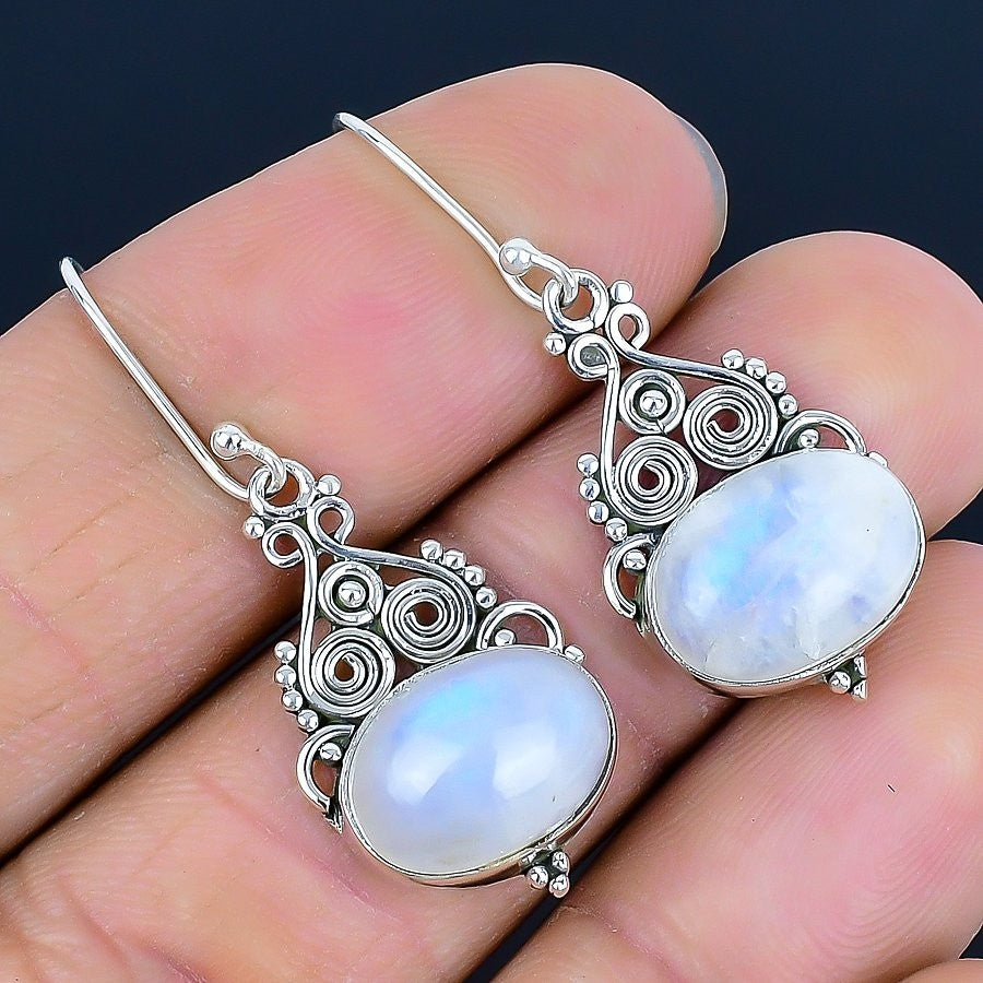 Elegant Rainbow Moonstone Stone Solid Silver Dangle Hook in