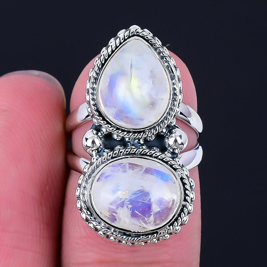 Rainbow Moonstone Stone Solid Sterling Silver Cluster Sister Ring Jewelry Size 5