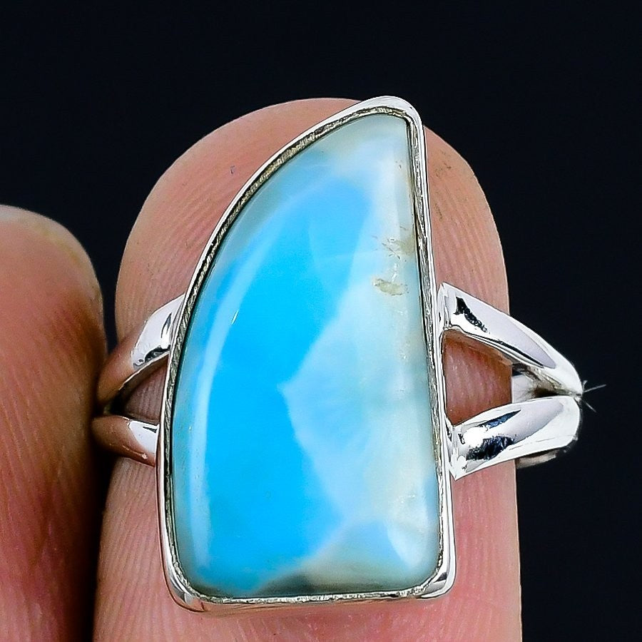 Republic Larimar Stone 925 Solid Silver Statement Engagement Bezel Ring Size 7.5