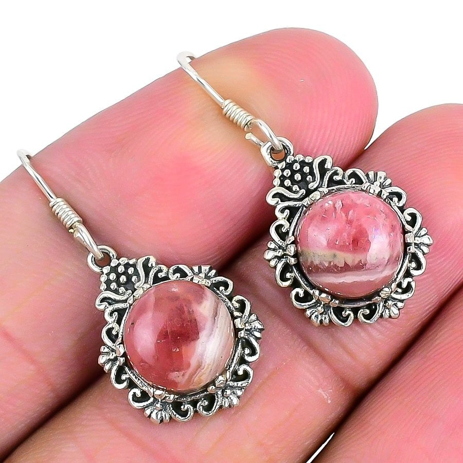 Rhodochrosite Stone Solid Sterling Silver Dangle Drop Artisan Earrings Jewelry