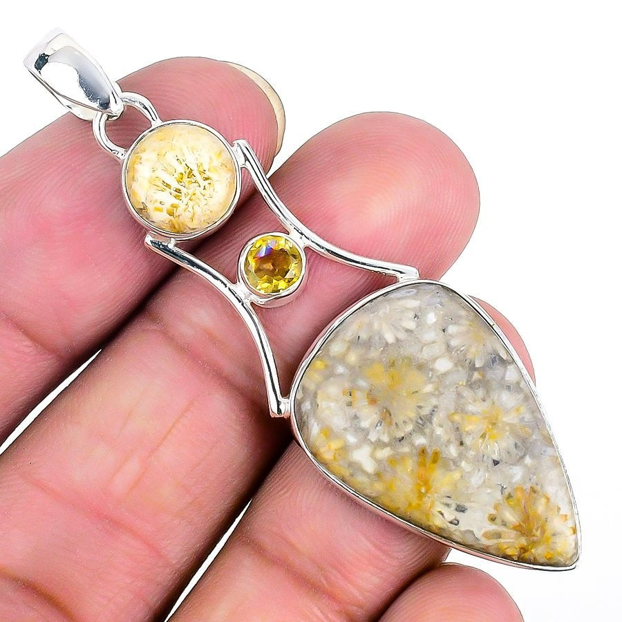 Root Chakra Fossil Coral Stone Solid Silver Bezel Elegant Mother Pendant Jewelry