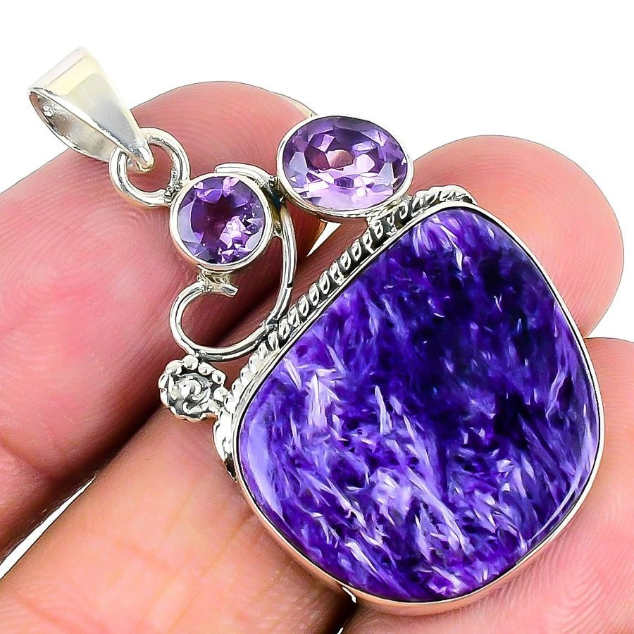 Russian Charoite Stone 925 Silver Art Deco Daughter Unique Bezel Pendant Jewelry