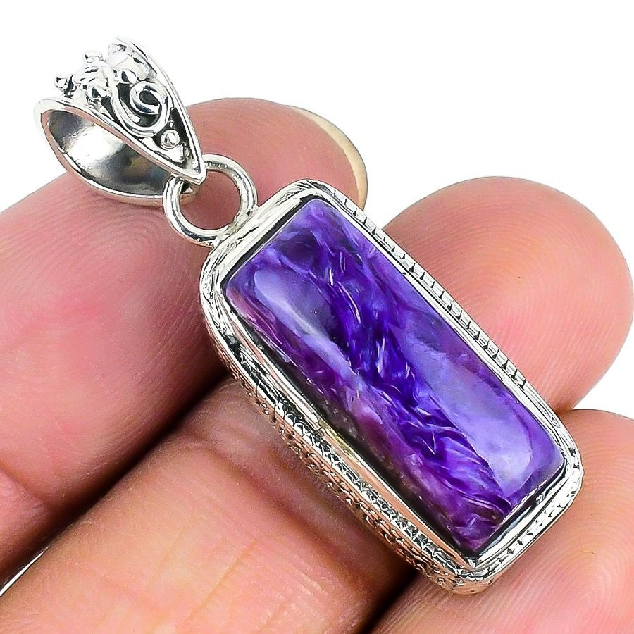 Russian Charoite Stone Art Deco Boho Bezel Mother Pendant 925 Sterling Silver