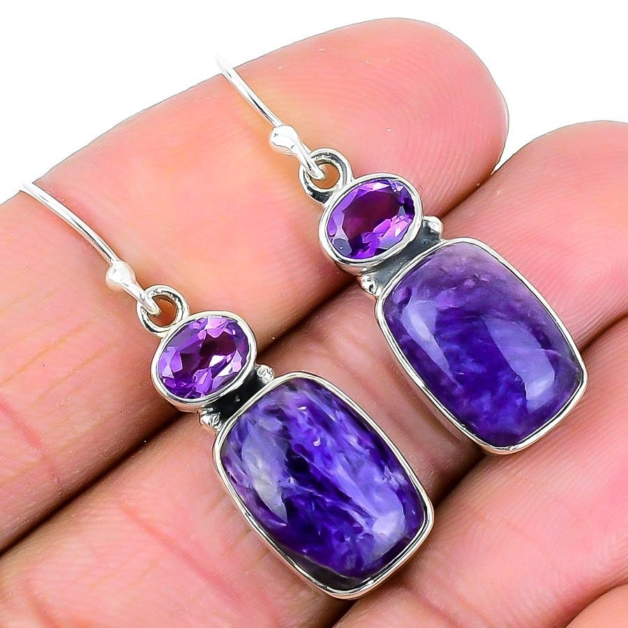 Russian Charoite Stone Dangle Drop Boho Sister Hook Earrings 925 Solid Silver